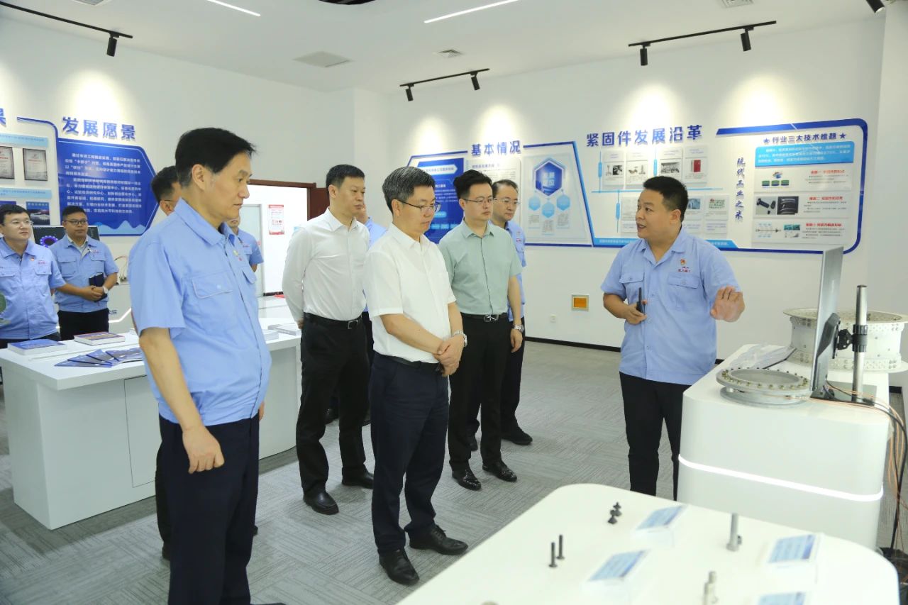 27日上午,陳錫明一行來到航天精工,深入航天精工研究院、機加鐓制車間、高端抽芯鉚釘自動化生產線等科研生產一線開展實地調研。陳錫明詳細了解了航天精工技術研發和產品配套等方面情況,聽取了航天精工關于生產經營、發展規劃、黨的建設和巡視整改等方面的情況匯報。