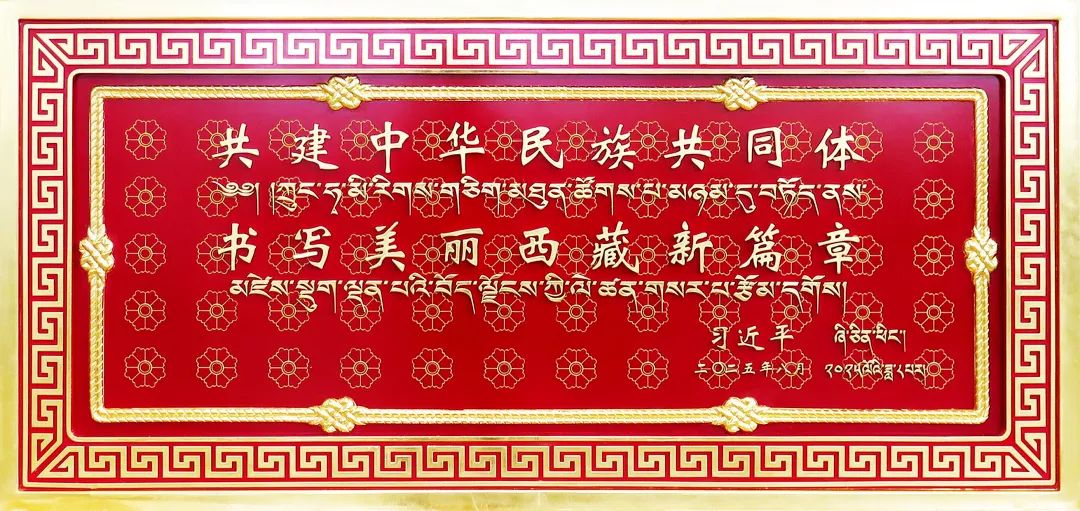 賀匾正面為習(xí)近平總書記題詞,背面展現(xiàn)西藏自治區(qū)成立60周年經(jīng)濟(jì)社會(huì)發(fā)展成就。整體造型端莊大氣,以鮮艷的中國(guó)紅為底色,采用格桑花紋、長(zhǎng)城紋、繩結(jié)紋等獨(dú)具匠心的特色設(shè)計(jì),象征民族團(tuán)結(jié)、共同繁榮,寓意各民族共同熔鑄為中華民族共同體。