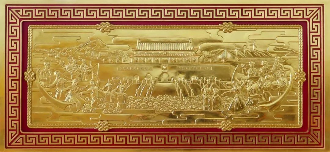 賀匾背面浮雕圖案造型整體采用貼金處理,為了更好體現(xiàn)浮雕效果,項(xiàng)目團(tuán)隊(duì)采用薄壁紫銅板鈑金制作,針對(duì)人物面部進(jìn)行精細(xì)鏨刻,完美體現(xiàn)人物面部特點(diǎn),生動(dòng)呈現(xiàn)“中華民族一家親”的和諧畫面。