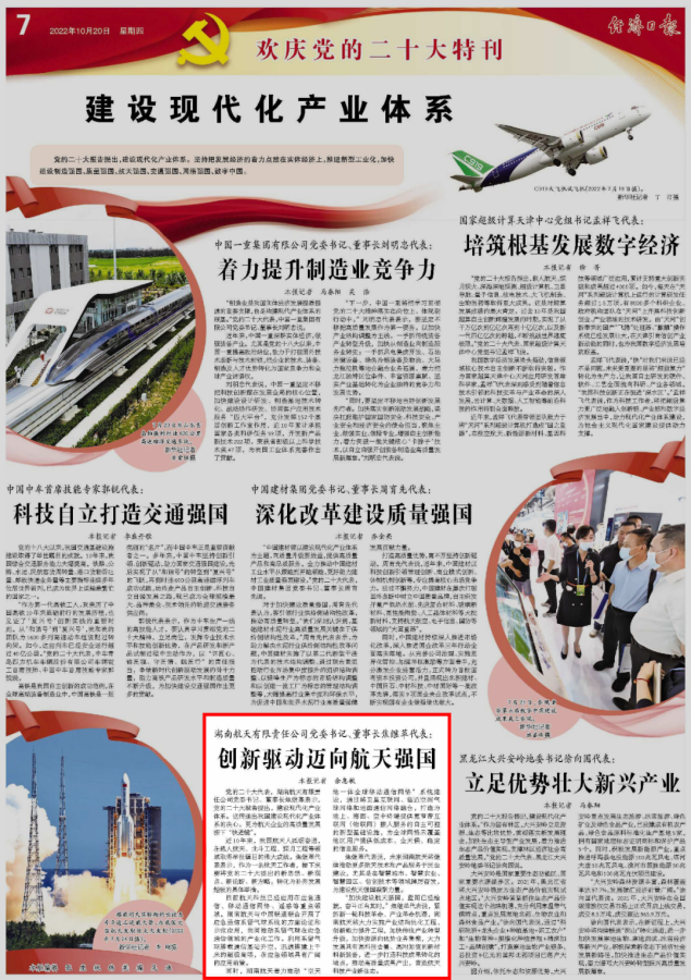 黨的二十大代表,湖南航天有限責任公司黨委書記、董事長焦繼革表示,黨的二十大報告提出,建設現代化產業體系。這傳遞出我國建設現代化產業體系的決心,更為航天企業的高質量發展按下“快進鍵”。